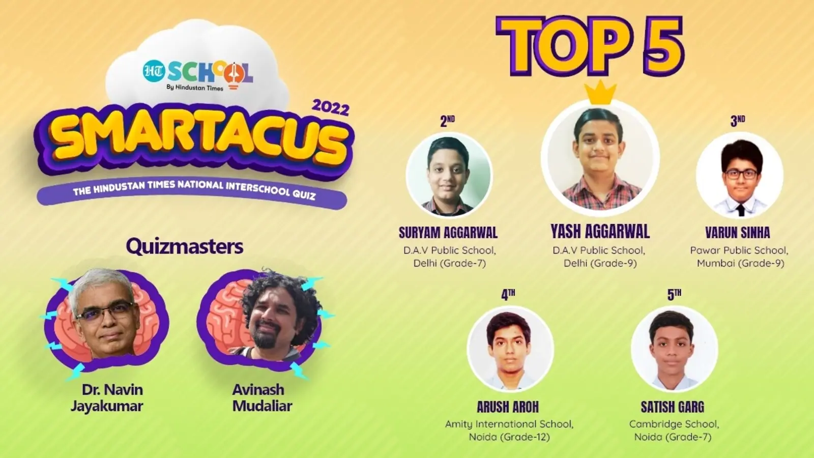Basking in the glory of quizzing limelight, the topper of the Selection Round, Yash Aggarwal, Grade 9, D.A.V. Public School, Delhi, says, “I am really happy to have grabbed the top spot in the Smartacus 2022 Selection Round itself.” Yash had also participated in the previous quizzing venture of HT School, ClassAct 2022, The Hindustan Times Republic Day Quiz.